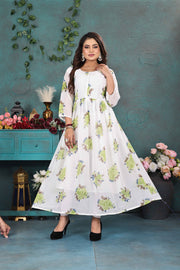 Graceful White & Green Floral Georgette Gown